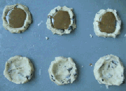 5) form cups with the chocolate chip cookie dough and fill with the coffee filling.