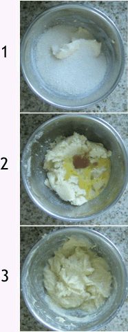 2) mix sugar and butter to a fluffy paste, add egg & vanilla, mix well.