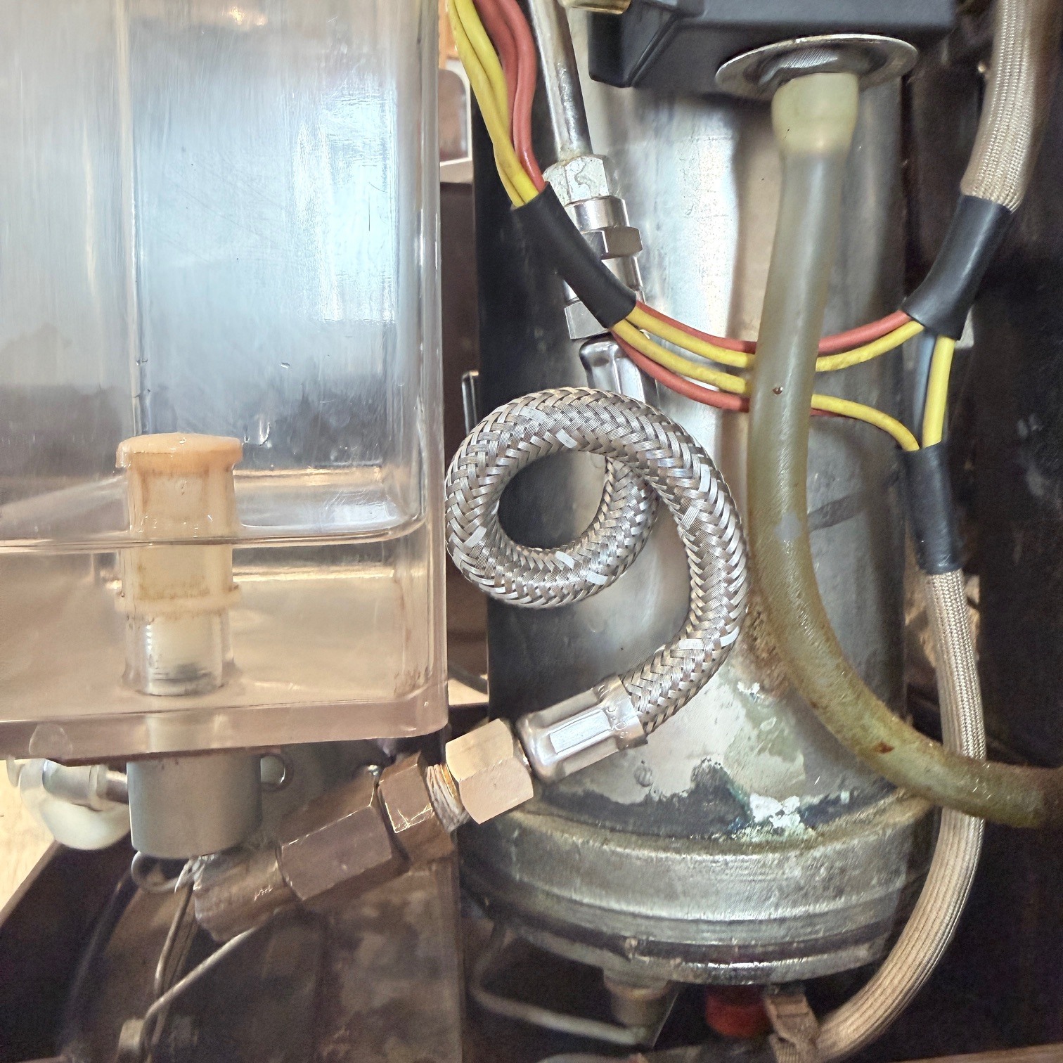 - Use a 1/8" to 1/8" braided tube (repurposed Rancilio Silvia supply tube) to connect check valve to solenoid valve stem (potential to re-use the teflon tube here).